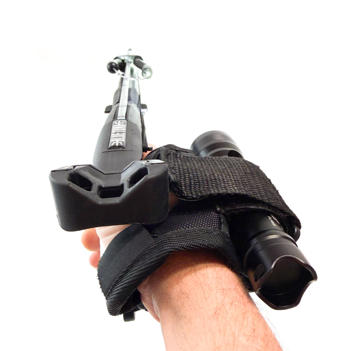 The hand mount allows your hands to be free to grip the handle of a speargun or grab lobster. We also provide a speargun mount if you like to put the light up near the muzzle.